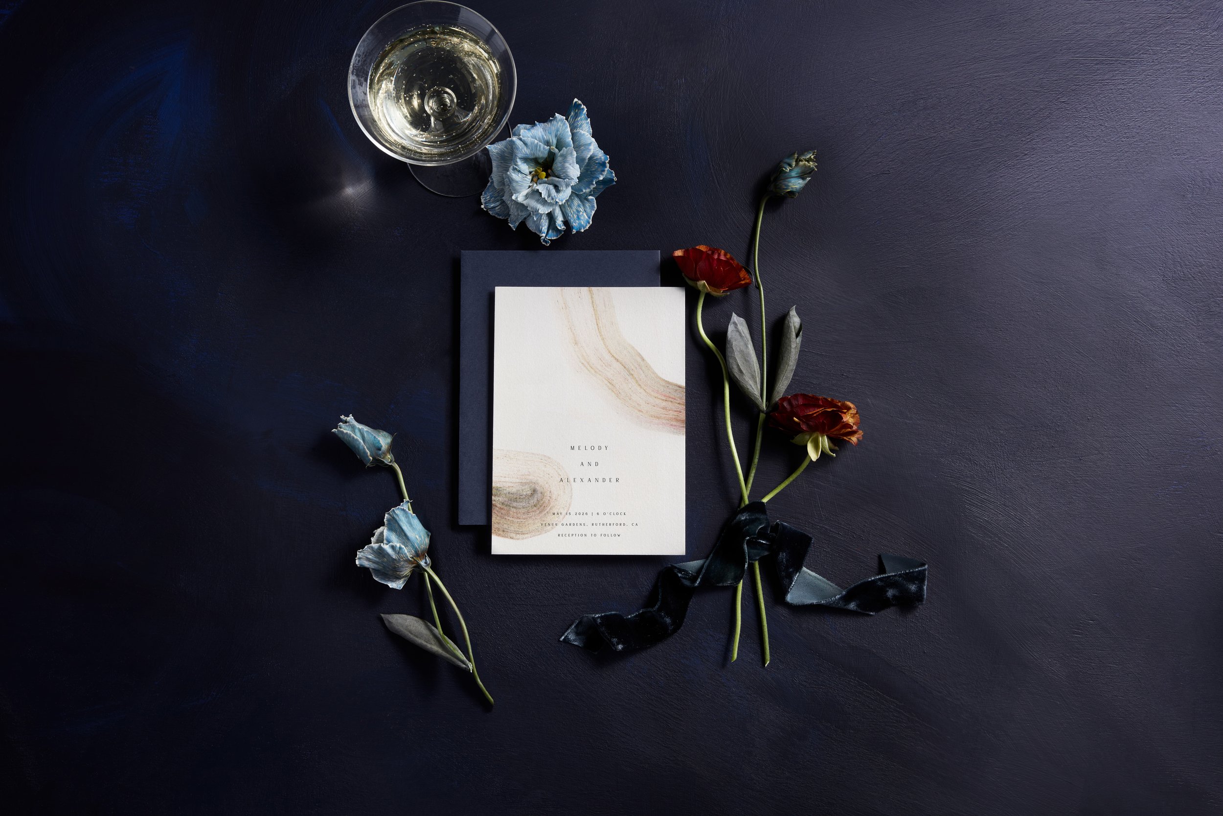 Inspired by the morning after a party at a country estate before anyone has gone to bed, this look represents Minted’s classic and formal segment and is all about loosened black tie and beautiful blown glass stemware.